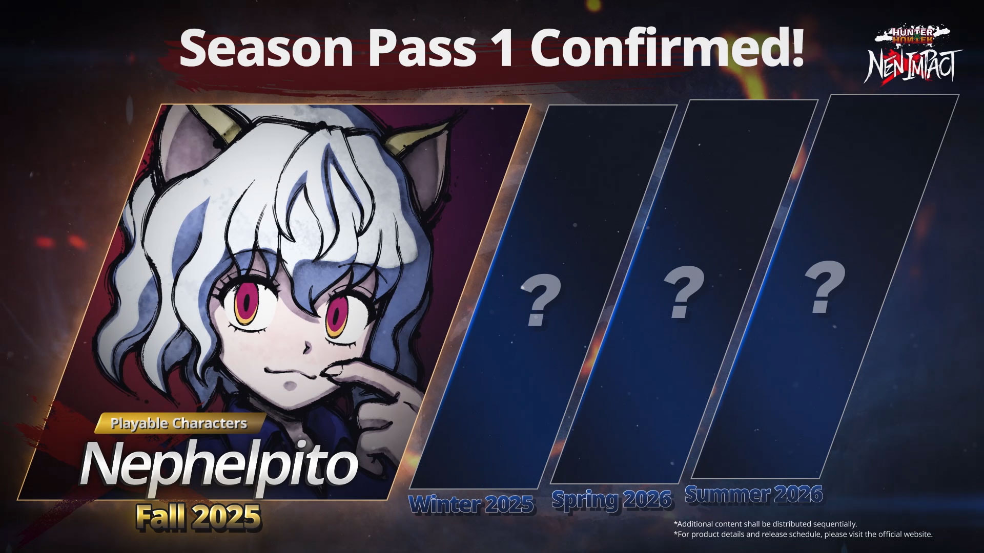 The HUNTER×HUNTER NEN×IMPACT Season Pass includes 4 playable characters and 1 character costume as additional downloadable content.